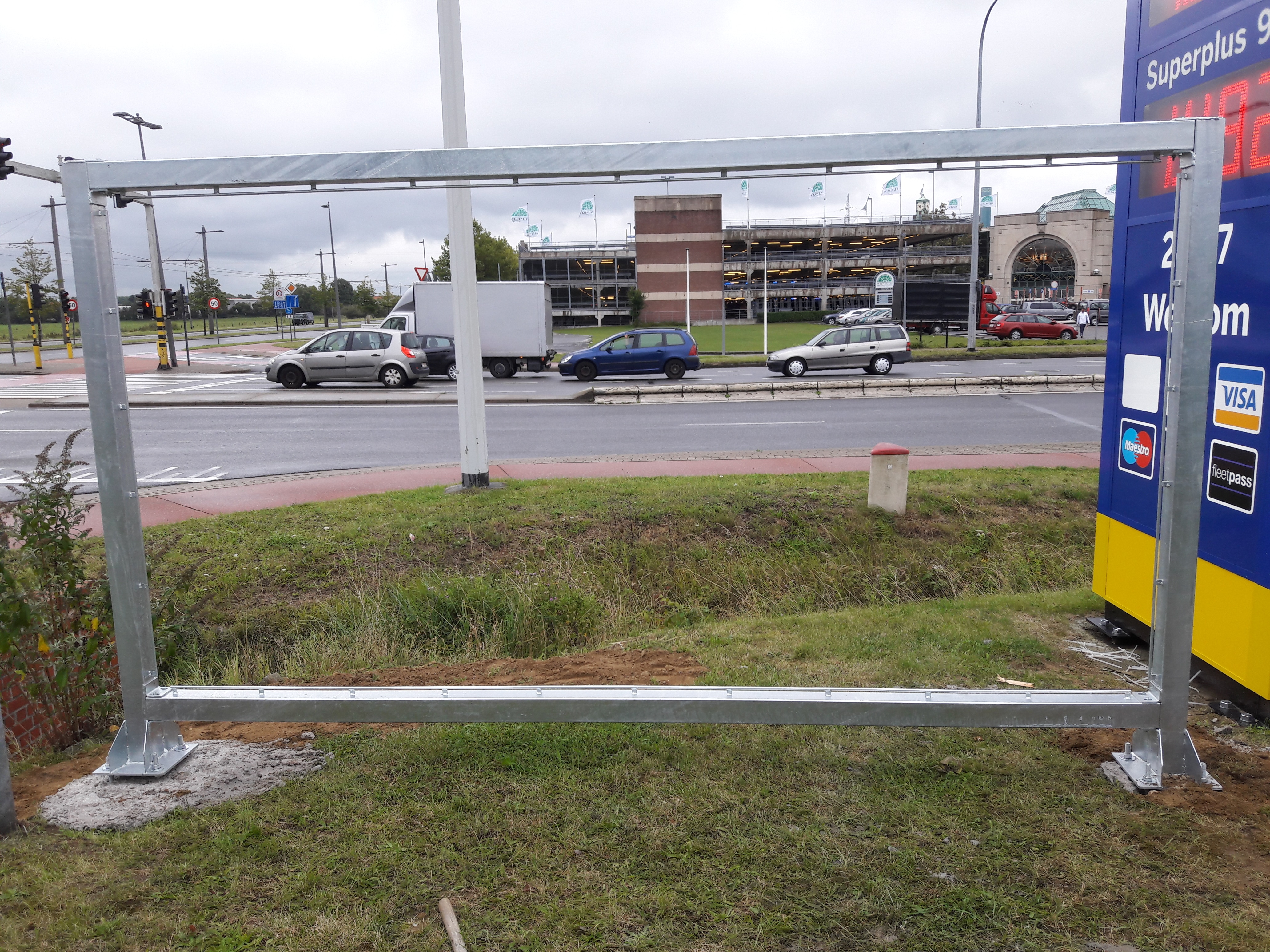Deze stevige gegalvaniseerde stalen constructies bestaan uit kokers van 100 x 100 mm die aan de binnenkant voorzien zijn van een volstaaf op afstand waar met rubber rekkers het doek kan worden ingespannen. Deze kunnen tot 6 m hoog en oneindig breed, vierkant, v-opstelling, enz… gerealiseerd worden. Ook aannemersconstructies waar onderaan gewicht door middel van betonblokken dient opgelegd te worden zijn één van de mogelijkheden.