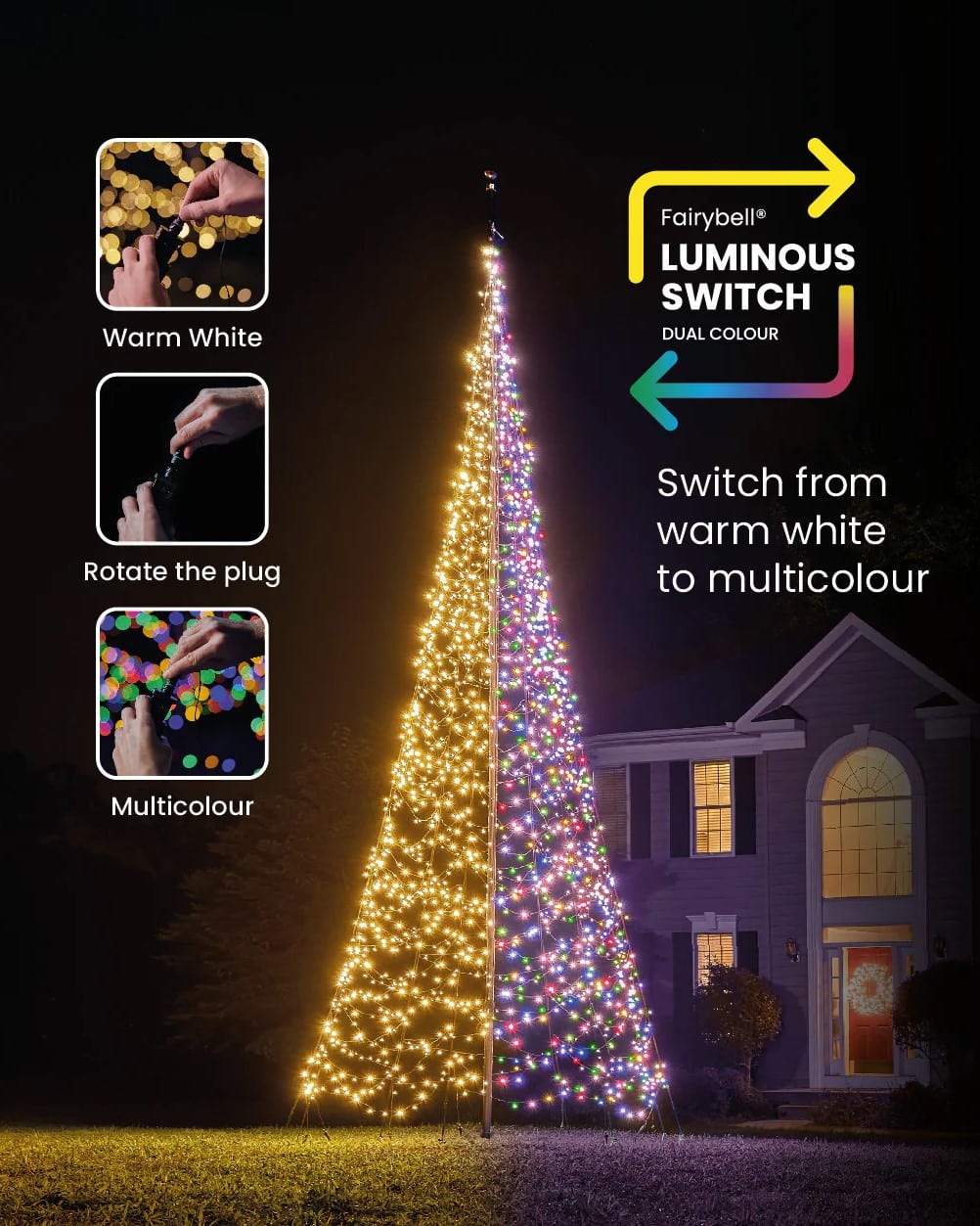 Deze LED kerstboom geschikt voor een 6 meter hoge mast is voorzien van 2000 energiezuinige LED-lampjes en is speciaal ontworpen voor in een vlaggenmast maar deze kan ook op een gewone mast bevestigd worden. Wat deze variant zo bijzonder maakt, is de mogelijkheid om eenvoudig te switchen tussen warm wit en multicolour verlichting of zelfs een combinatie van beide.